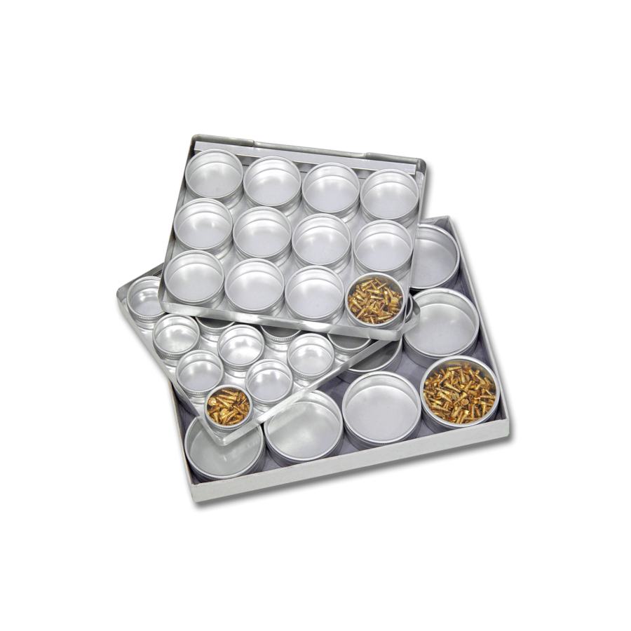 Enquire NowStorehouses of little things. Glass topped with aluminium containers excellent for organizing small parts or screws, beads, seeds just about anything small. A set of 12 pcs in an outer box of aluminium / cardboard.