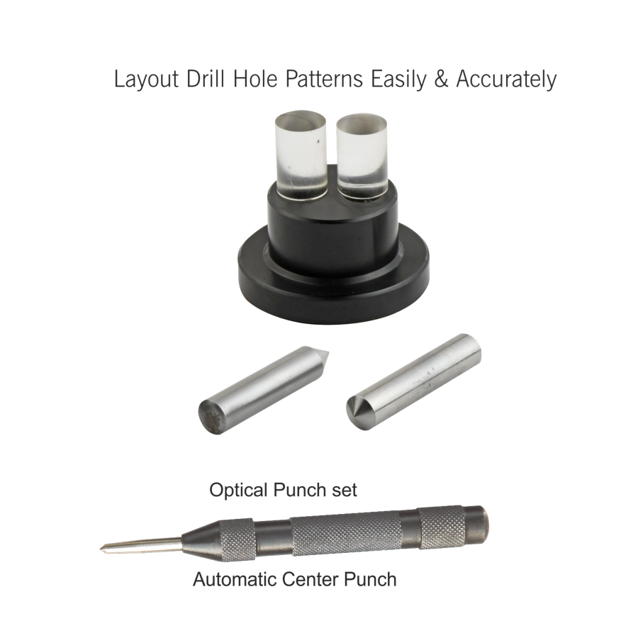 Our optical center punch is a highly accurate method of aligning the intersecting points of scribed line for layout and drill hole patterns quickly and easily. Easy to use, just align the base with the optical centered on the spot which a small indentation is required, replace the optical punch with the hardened steel punch and strike gently with a hammer.