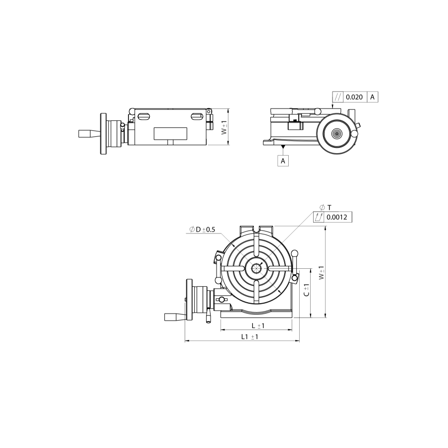 Enquire NowManufactured from graded cast iron and precision ground. Worm is hardened and ground. The worktable is graduated to a full 360°. For tables having a ratio of 90:1 one turn of the handle moves the table 4°. The micro collar is graduated in steps of 1 min. Vernier scale makes setting down to 10 seconds possible. We also offer indexing sets and tail stocks. 111320 Tilting table is suitable for 4"/100mm rotary table No. 110240.