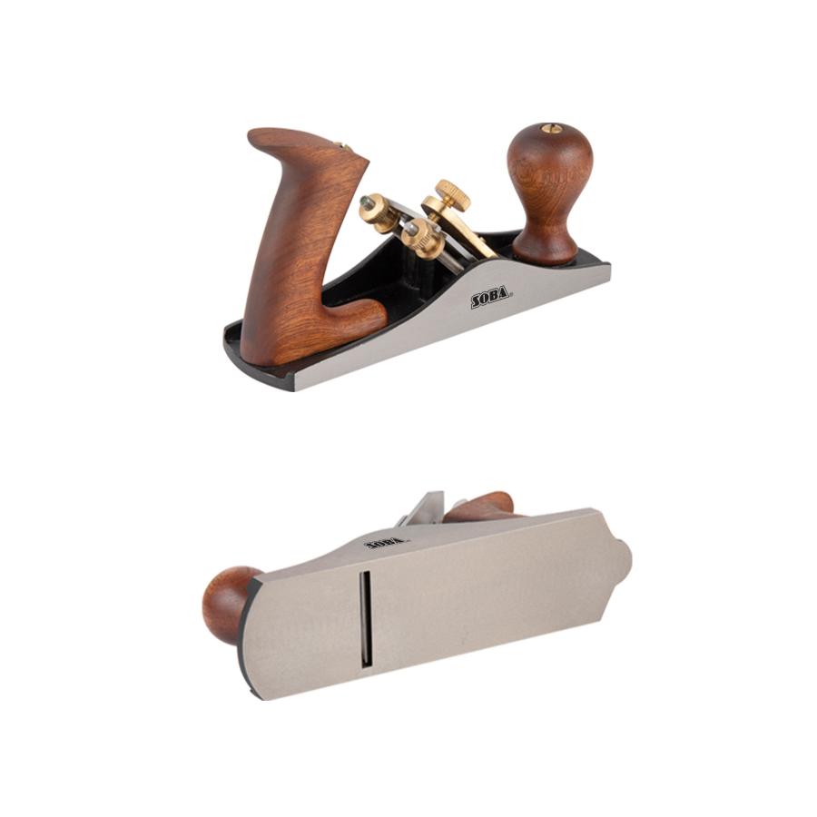 A handy plane with a ductile cast iron body and wooden handle.  Brass lever cap with brass screw. This plane is easily adjustable by means of two knurled screws for cut iron alignment and depth of cut.